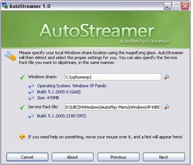--CD Mode: If you pick cd mode, AutoStreamer will attempt to read your pc's cd drives to detect any windows cds. If you have already inserted your cd in, AS will find it. If not, insert it, and click on the first magnifying glass icon to detect it. After detection suceeds, pick the service pack file by clicking the second magnifying glass icon. AS will attempt to detect what kind of file it is. If all goes well and its a valid SP file (meaning its the correct version, and newer than the source, it is valid) you will be ready to continue to step 2.